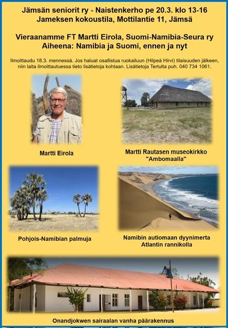 Naistenkerhossa on vieraana Suomi-Namibiaseuran puheenjohtaja FT Martti Eirola. Hän kertoo Namibian historiaa ja nykytilannetta. Ilmoittaudu mukaan tapahtumakalenterissa viimeistään 18.3. Lisätietoja Tertulta.